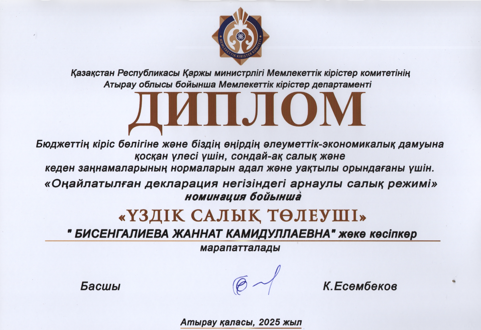 In 2025, individual entrepreneur Zhannat Kamidullayevna Bisengalieva was awarded a diploma in the nomination “Uzdik salyk toleushi” (Best Taxpayer). The award was presented by the State Revenue Department of the Atyrau Region of the State Revenue Committee of the Ministry of Finance of the Republic of Kazakhstan.